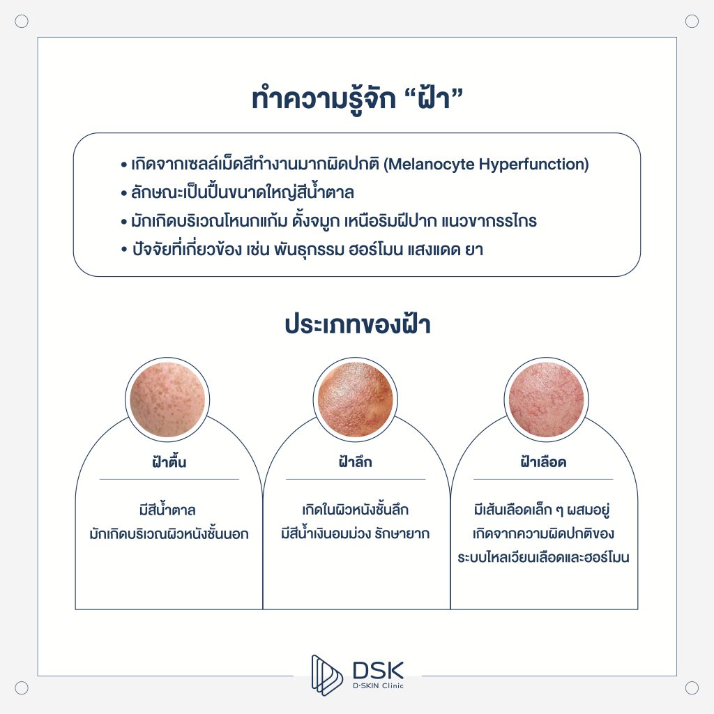 | – ฝ้าและกระเป็นปัญหาผิวที่แตกต่างกัน โดยฝ้าเป็นปื้นสีน้ำตาลขนาดใหญ่ที่เกิดจากเซลล์สร้างเม็ดสีทำงานผิดปกติ ในขณะที่กระเป็นจุดสีน้ำตาลเล็กๆ ที่เกิดจากการสะสมของเม็ดสีเมลานิน จึงต้องใช้วิธีการรักษาที่แตกต่างกัน – การรักษาฝ้าต้องทำแบบองค์รวม ทั้งการหลีกเลี่ยงปัจจัยกระตุ้น การใช้ยาทาและยารับประทาน การผลัดเซลล์ผิว การใช้เลเซอร์ที่เหมาะสม โดยเฉพาะ Redtouch Pro และ Picosecond Laser – กระมี 4 ประเภท ได้แก่ กระตื้น กระแดด กระลึก และกระเนื้อ แต่ละประเภทต้องใช้วิธีการรักษาที่แตกต่างกัน เช่น กระตื้นและกระแดดใช้ Picosecond Laser หรือ Redtouch pro ส่วนกระเนื้อต้องใช้ CO2 Laser – การวินิจฉัยที่แม่นยำและการเลือกวิธีการรักษาที่เหมาะสมเป็นสิ่งสำคัญ เพราะการรักษาที่ผิดวิธีอาจทำให้ปัญหาแย่ลง เช่น การใช้เลเซอร์ผิดประเภทกับฝ้าอาจทำให้ฝ้าเข้มขึ้นได้ – ที่ DSK Clinic มีทีมแพทย์ผู้เชี่ยวชาญ และเครื่องมือมาตรฐาน USFDA พร้อมให้การวินิจฉัยและวางแผนการรักษาเฉพาะบุคคล เพื่อให้ได้ผลลัพธ์การรักษาที่มีประสิทธิภาพสูงสุดและปลอดภัย |