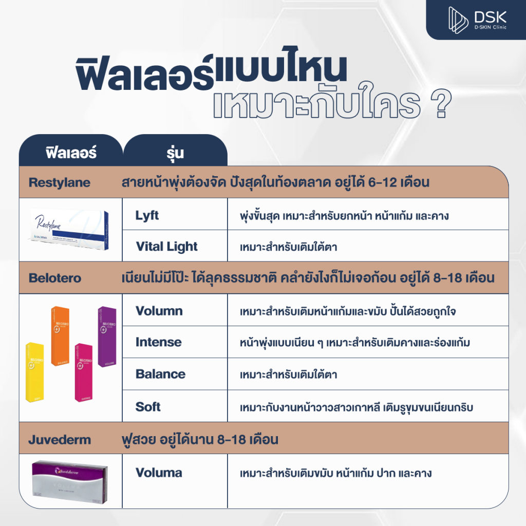 - แต่ถ้าโครงสร้างค้ำจุนหายไป กระดูกกร่อน ไขมันลดลง เส้นเอ็นหย่อน ในขณะที่ผิวหนังไม่ได้หย่อนมาก การใช้ Filler เพื่อทดแทนโครงสร้างค้ำจุนที่หายไป ก็เป็นทางเลือกที่เหมาะสม