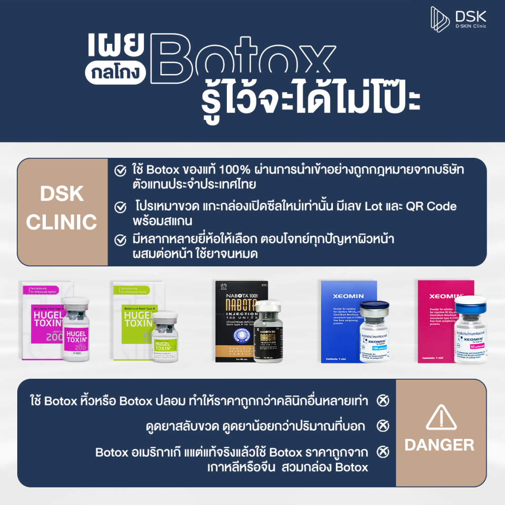 สิ่งที่ควรระวังเกี่ยวกับโบท็อกซ์คือ ปัจจุบันยาปลอมและยาหิ้วมีเยอะมาก แม้กระทั่งในคลินิกหลายแห่งก็ตาม โดยยากลุ่มนี้ล้วนเป็นยาผิดกฎหมาย ไม่รู้ที่มาที่ไป ลักลอบนำเข้า มักเป็นโบท็อกซ์จากจีนที่มาสลับกล่องเอา โบท็อกซ์กลุ่มนี้อันตรายเพราะเราไม่รู้มาตรฐานในการผลิต อาจได้ผลบ้างไม่ได้ผลบ้าง หรือถ้าโชคร้ายในขวดอาจมียามากกว่าที่ระบุ 10 เท่า แทนที่จะได้ผลที่พอใจ กลับมากเกินไปจนต้องเข้าโรงพยาบาลมาก็มีมาแล้ว ดังนั้นควรเช็คให้ชัวร์ก่อนฉีดว่ายาที่ใช้เป็นยาแท้