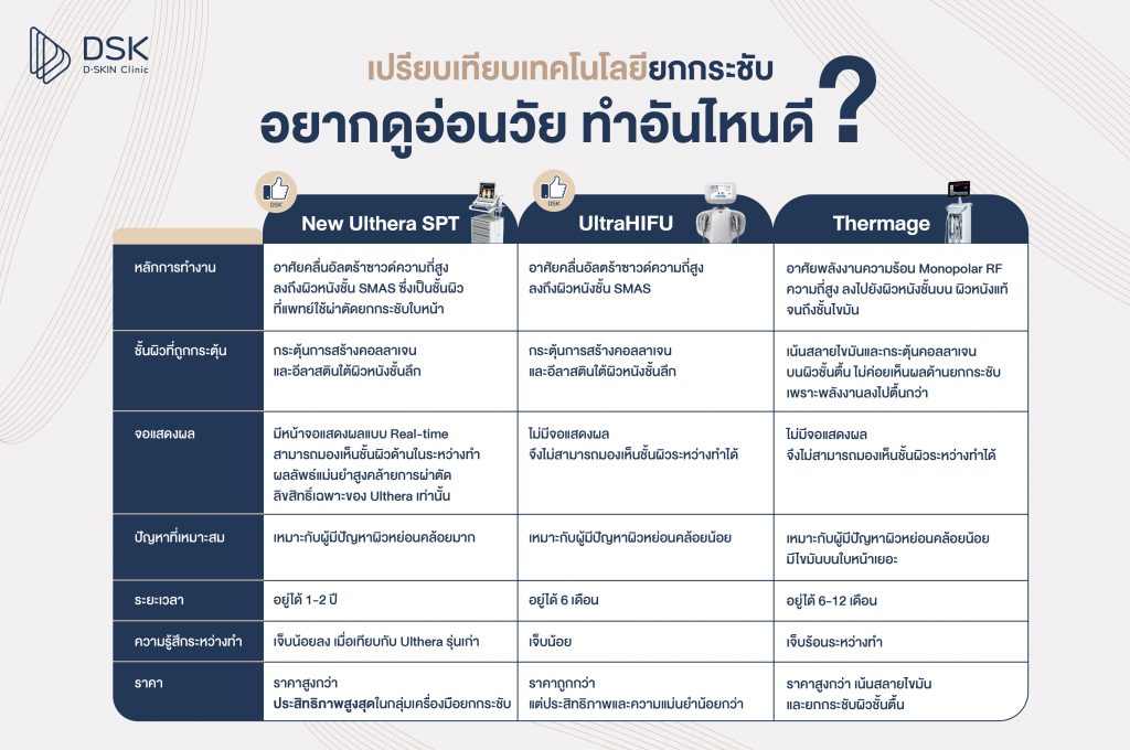 HIFU และ Ulthera จะเน้นการยกกระชับในคนที่มีผิวหนังหย่อนคล้อยหรือไม่กระชับ เปรียบเสมือนการยกผิวหน้า เทียบเท่าการศัลยกรรม ไม่ต้องผ่าตัด