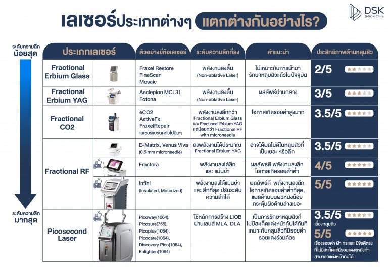 และแล้วเราก็เดินทางมาถึงกลุ่มเลเซอร์กลุ่มสุดท้าย นั่นก็คือ 3 ดาวเด่นอย่าง Fractora, Infini และ Picosecond Laser ซึ่งเป็นเครื่องที่ DSK Clnic ไว้วางใจและเลือกใช้รักษาหลุมสิวให้คนไข้ของเรา โดยเจ้าเครื่องพวกนี้ล้วนเป็นเทคโนโลยีใหม่ที่มีประสิทธิภาพ และสามารถจัดการกับปัญหาหลุมสิวได้อย่างดีเยี่ยม มาดูกันทีละตัวดีกว่าว่าแต่ละเครื่องทำงานยังไง และเหมาะกับหลุมสิวประเภทไหนบ้าง