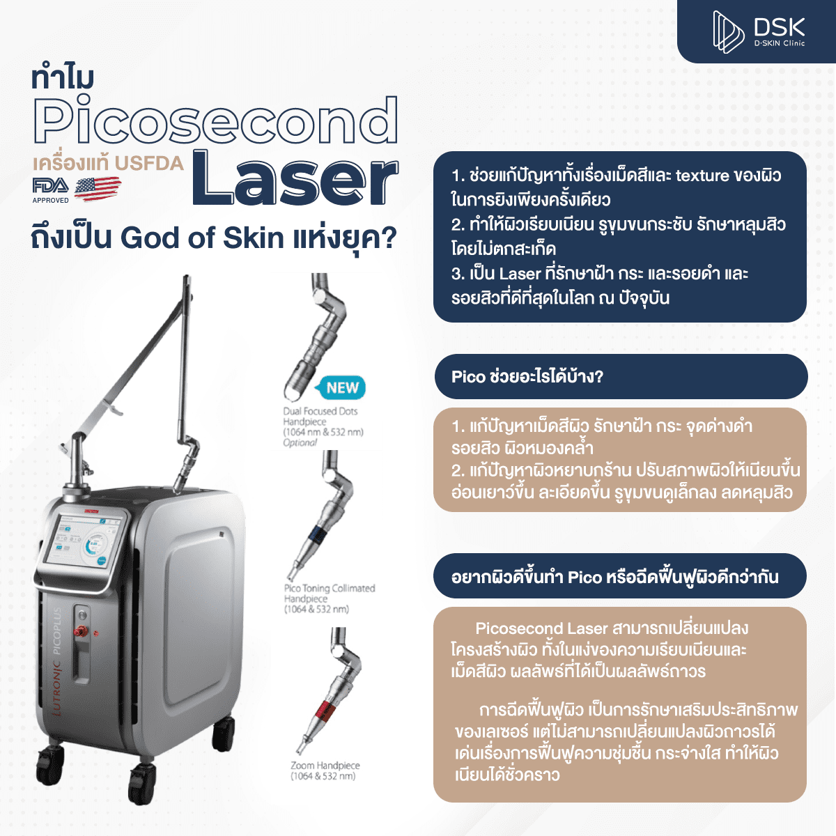 - ทั้งนี้ทั้งนั้น เหนือฟ้ายังมีฟ้า เหนือ Infini และ Fractora ก็ยังมี Pico Laser โดยเจ้าเครื่องนี้เป็นนวัตกรรมเลเซอร์ตัวใหม่ล่าสุดในรอบทศวรรษ ความสามารถของมันคือสามารถปล่อยพลังงานเลเซอร์ที่ความเร็วหนึ่งในล้านล้านวินาที จึงเป็นที่มาของชื่อ Picosecond โดยพลังงานที่ปล่อยออกมาอย่างรวดเร็วนี้จะทำให้เม็ดสีผิว (Melanin) แตกตัวอย่างละเอียด ขณะเดียวกันก็กระตุ้นให้เกิดช่องว่างเล็กๆใต้ผิว (Microcavity) ที่เราเรียกว่า LIOB (Laser-induced optical breakdown) ซึ่งช่องว่างเล็ก ๆ ใต้ผิวนี้เองจะกระตุ้นให้เกิดการสร้างคอลลาเจนใต้ชั้นผิว โดยที่ไม่เกิดสะเก็ดที่ผิวด้านบนเลยแม้แต่นิดเดียว ดังนั้น Picosecond Laser จึงตอบโจทย์ปัญหางานผิวทั้งหมด ไม่ว่าจะเป็นเม็ดสี หรือความเรียบเนียน แบบที่ไม่มีเลเซอร์ตัวไหนในโลกทำได้ ยิ่งไปกว่านั้น คนไข้ยังสามารถแต่งหน้าหลังการรักษาได้ทันทีแบบที่ไม่มีสะเก็ดมากวนใจอีกด้วย