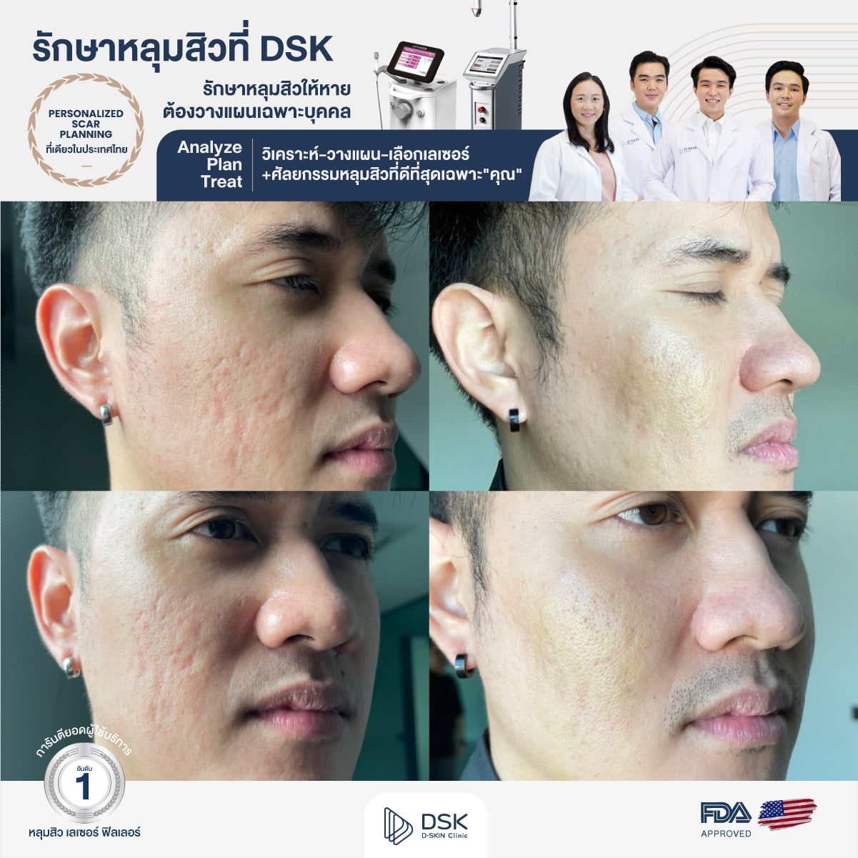 ที่ DSK Clinic เราผสาน 3 ขั้นตอนจำเป็นเหล่านี้ เพื่อให้เกิดแผนการรักษาหลุมสิวเฉพาะบุคคล หรือ Personalized Scar Planning เพราะเราเชื่อว่าหลุมสิวของแต่ละคนแตกต่างกัน และสภาพผิวของแต่ละคนไม่เหมือนกัน รวมทั้งหลุมสิวบนใบหน้าของคนเดียวกันก็ยังมีรายละเอียดยิบย่อยที่แตกต่างกันไปอีก ดังนั้นหากอยากรักษาหลุมสิวให้ได้ผล จึงจำเป็นต้องวางแผนทีละขั้นตอน ประเมินให้ถูกต้อง และเลือกเครื่องมือและหัตถการที่เหมาะสมกับคุณจากทั่วทุกมุมโลก เพื่อให้คนไข้แต่ละคนได้รับแผนการรักษาที่จำเพาะ แตกต่าง และได้ผลลัพธ์ที่ดีที่สุด