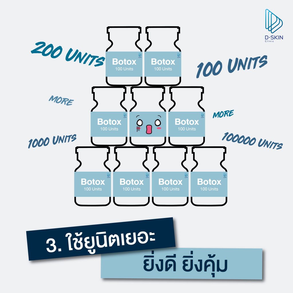 มีคนไข้จำนวนมากเข้ามาหาหมอแล้วบอกว่าอยากฉีดโบท็อกซ์กรามข้างละ 100 unit อยากฉีดริ้วรอย 200 unit ซึ่งมันเป็นไปไม่ได้ ในคลินิกที่ไม่ได้มาตรฐานมักบอกจำนวนยูนิต “เกินที่ใช้จริง” เพื่อให้คนไข้รู้สึกว่าคุ้ม ได้ยาเยอะ