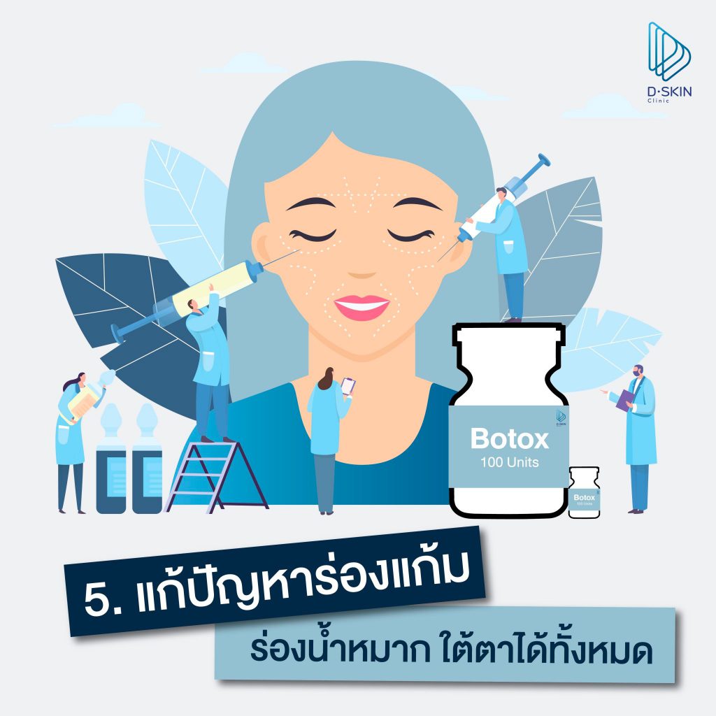 หน้าที่หลักของโบท็อกซ์ คือ การ “คลายกล้ามเนื้อ” ดังนั้นปัญหาที่โบท็อกซ์แก้ได้คือ ริ้วรอยจากการหดเกร็งหรือการขยับกล้ามเนื้อขณะแสดงสีหน้า เช่น ตีนกา หน้าผาก หว่างคิ้ว แต่ในกรณีของร่องแก้มหรือร่องใต้ตา ปัญหาพวกนี้เกิดจากปริมาตรของไขมันหรือกระดูกที่หายไป ดังนั้นจึงไม่เหมาะกับการใช้โบท็อกซ์แก้ไข แต่เหมาะกับการใช้ ฟิลเลอร์เพื่อเติมเต็มมากกว่านั่นเอง