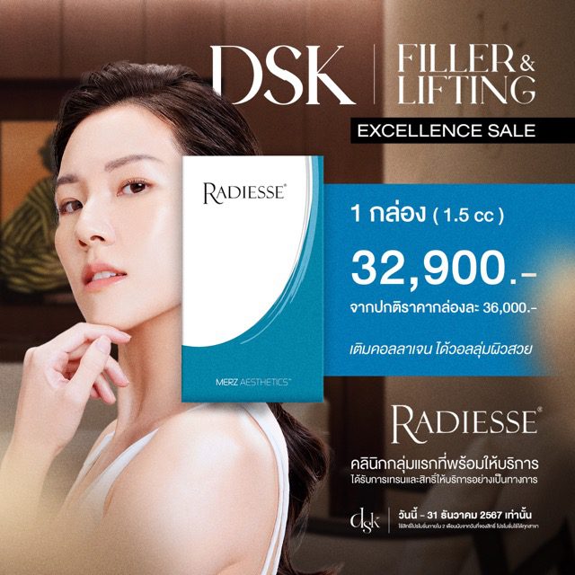 - นอกจากนี้ทีมแพทย์ DSK Clinic เทรนเทคนิคการฉีด Radiesse แบบแอดวานซ์ จาก บริษัท Merz Aesthetics โดย DSK Clinic เป็น 1 ใน 100 คลินิกแห่งแรกของประเทศไทยที่พร้อมให้บริการ เป็นคลินิกที่ได้รับสิทธิ์อย่างเป็นทางการจาก Merz และเป็น Certified Injector