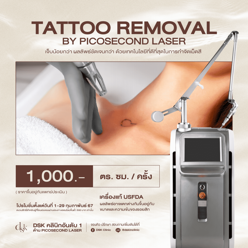สำหรับท่านใดที่สนใจทำเลเซอร์ลบรอยสักด้วยเครื่อง Pico Laser ที่ DSK Clinic เรามีโปรโมชันเลเซอร์ลบรอยสัก ราคาเริ่มต้นที่ 1,000 บาทต่อตารางเซนติเมตร ต่อครั้ง โดยราคาจะขึ้นอยู่กับการประเมินของแพทย์ผู้ทำการรักษาอีกครั้ง ถ้าสนใจ สามารถจองคิวเข้ามาปรึกษาคุณหมอที่คลินิกได้เลย