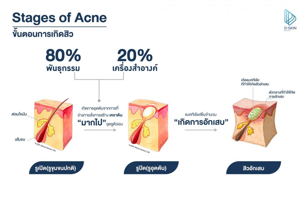 ดังนั้นรูขุมขนที่ควรจะเปิด จะถูกอุดด้วยเคราติน ซึ่งเป็นผลพวงมาจากฮอร์โมนและพันธุกรรม เมื่อรูขุมขนอุดตัน มีไขมันสะสมมากขึ้น แบคทีเรีย “C. acnes” (Cutibacterium acnes หรือเมื่อก่อนเรียกว่า P. acnes) ที่เดิมมีบนผิวอยู่แล้วจะเพิ่มจำนวนมากขึ้น ทำให้เกิดเป็นตุ่มอักเสบขึ้นมา