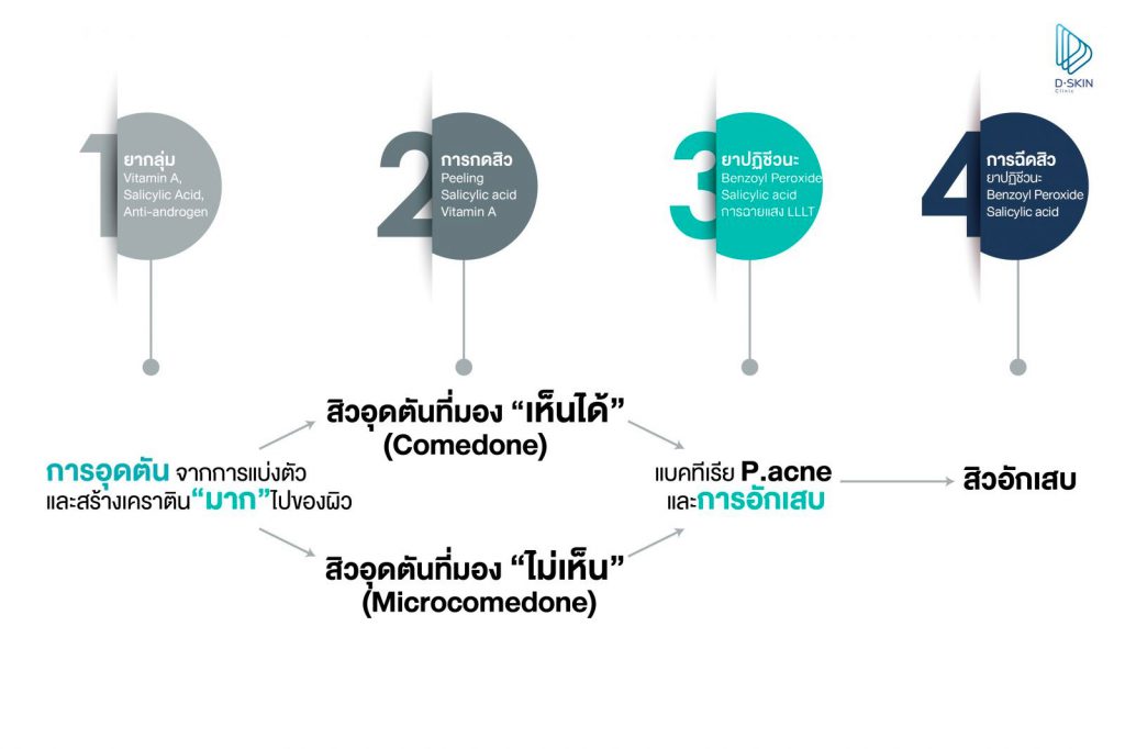 - นั่นเป็นเพราะเราไม่ได้ใช้ยาที่ “ช่วยลดการอุดตัน” ซี่งเป็นสาเหตุของสิว แต่ไปลดผลลัพธ์ซึ่งคือ “สิวอักเสบเท่านั้น”