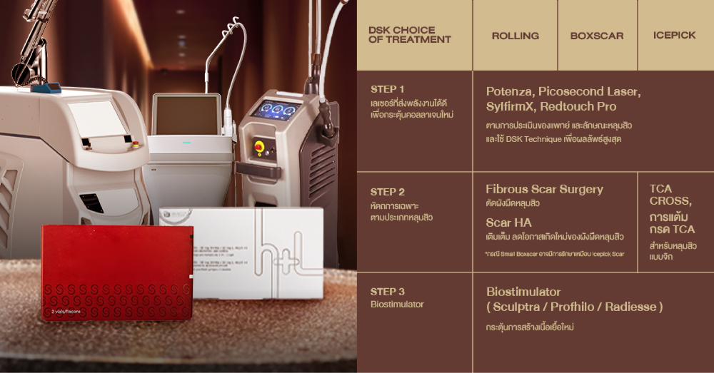 Acne Scar Biostimulator คือ โปรแกรมฟื้นฟูรอยหลุมสิวด้วยสารกระตุ้นการสร้างคอลลาเจน (Collagen Biostimulator) ที่ช่วยซ่อมแซมผิวจากภายใน กระตุ้นการสร้างเนื้อเยื่อใหม่ เติมเต็มรอยหลุมให้ตื้นขึ้นอย่างเป็นธรรมชาติ ทำให้ผิวเรียบเนียน แข็งแรง และยืดหยุ่นขึ้นในระยะยาว โดยแพทย์จาก DSK Clinic มีเทคนิคพิเศษในการออกแบบการรักษาเฉพาะบุคคล เพื่อให้ผลลัพธ์ออกมาสวยเป็นธรรมชาติที่สุด