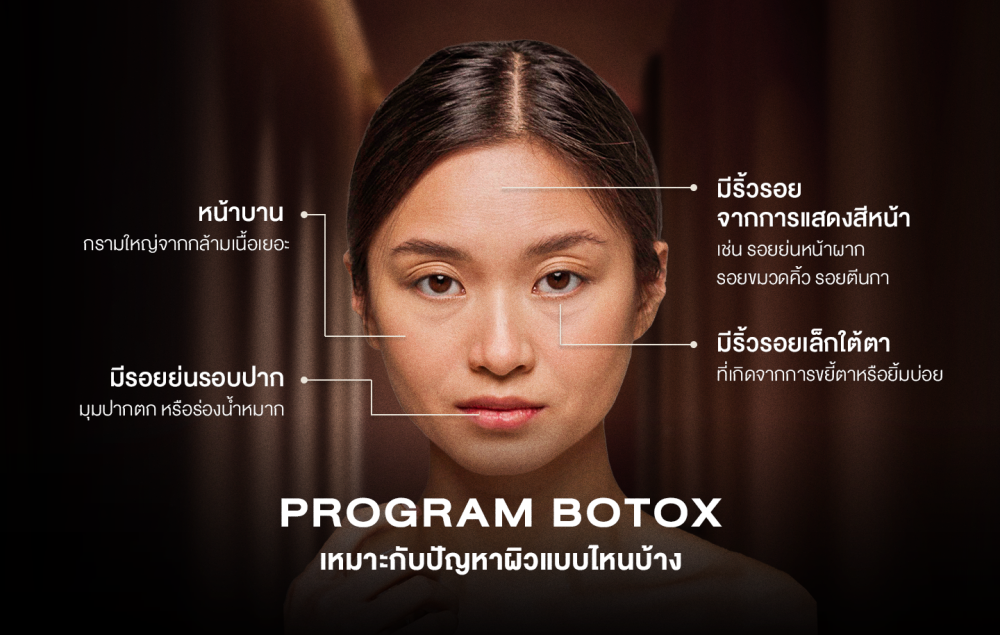 โปรแกรม Botox คือ การฉีดสาร Botulinum Toxin Type A ซึ่งมีจุดเด่นในการยับยั้งการทำงานของระบบประสาท ทำให้กล้ามเนื้อคลายตัวชั่วคราว เมื่อฉีดเข้าไปในบริเวณที่มีริ้วรอย เช่น รอยระหว่างคิ้ว หน้าผาก หรือหางตา ผิวหนังส่วนบนจะเรียบเนียนขึ้น ริ้วรอยจางลง และยังช่วยยกกระชับใบหน้า ทำให้ดูเรียวขึ้น นอกจากนี้ ยังช่วยลดกลิ่นตัวและเหงื่อบริเวณรักแร้และฝ่ามือ