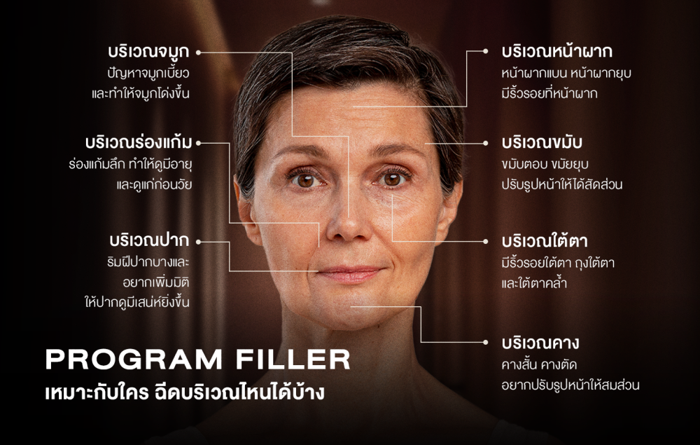 โปรแกรม Filler คือ สารที่ใช้ฉีดเติมเต็มเข้าไปใต้ผิวหนัง เพื่อทดแทนส่วนที่สูญเสียไปตามธรรมชาติเมื่อมีอายุเพิ่มมากขึ้น ซึ่งสารเติมเต็มผิวที่เรียกว่า Hyaluronic Acid (HA) เป็นสารที่เกิดขึ้นตามธรรมชาติบนผิวของคนเรา ซึ่งมีส่วนช่วยให้ผิวชุ่มชื้น เปล่งปลั่ง โดยการฉีดฟิลเลอร์จะช่วยแก้ไขปัญหาผิว ไม่ว่าจะเป็นการเติมเต็มร่องริ้วรอย ช่วยให้ผิวเต่งตึง กระชับ เปล่งปลั่ง ไม่หย่อนคล้อย ให้ผิวแลดูอ่อนเยาว์มากยิ่งขึ้น